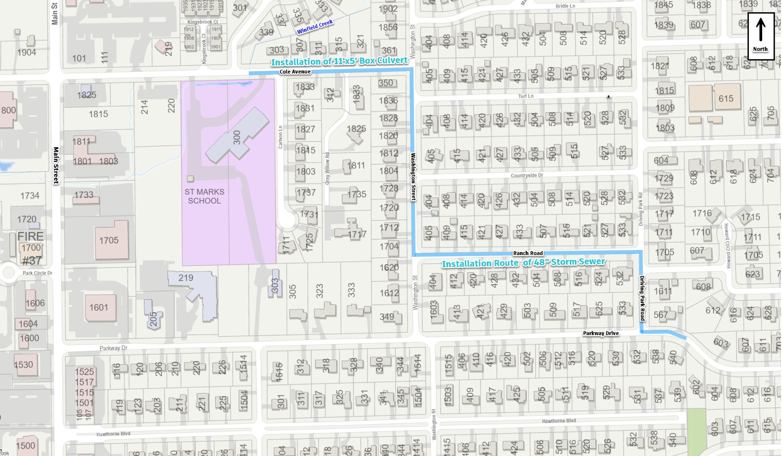 This project will include installing approximately 2,249 linear feet of 48” diameter storm sewer. Crews will also replace an existing 72” concrete pipe that is approximately 70 years old underneath Cole Avenue with 660 linear feet of an 11’ x 5’ concrete box culvert. The outfall at Winfield Creek at Cole will also be reconstructed to repair and prevent erosion damage.